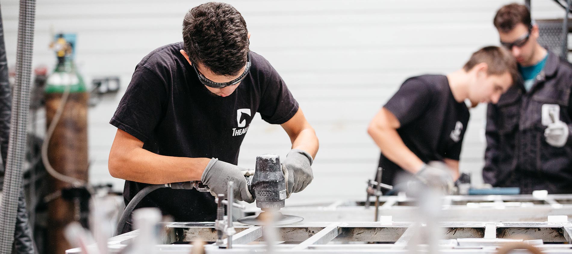 À la base de chaque camion THEAULT : un plancher cabine ! C’est sur ce premier poste de transformation que les équipes d’assemblage commencent par démonter l’intégralité de la cabine. Chaque pièce d’un véhicule est stockée sur un établi unique et identifié pour assurer un suivi qualité tout au long du processus de fabrication. Après démontage, un plancher polyester imputrescible est ensuite posé, ce dernier supportera toute la structure aluminium du véhicule.